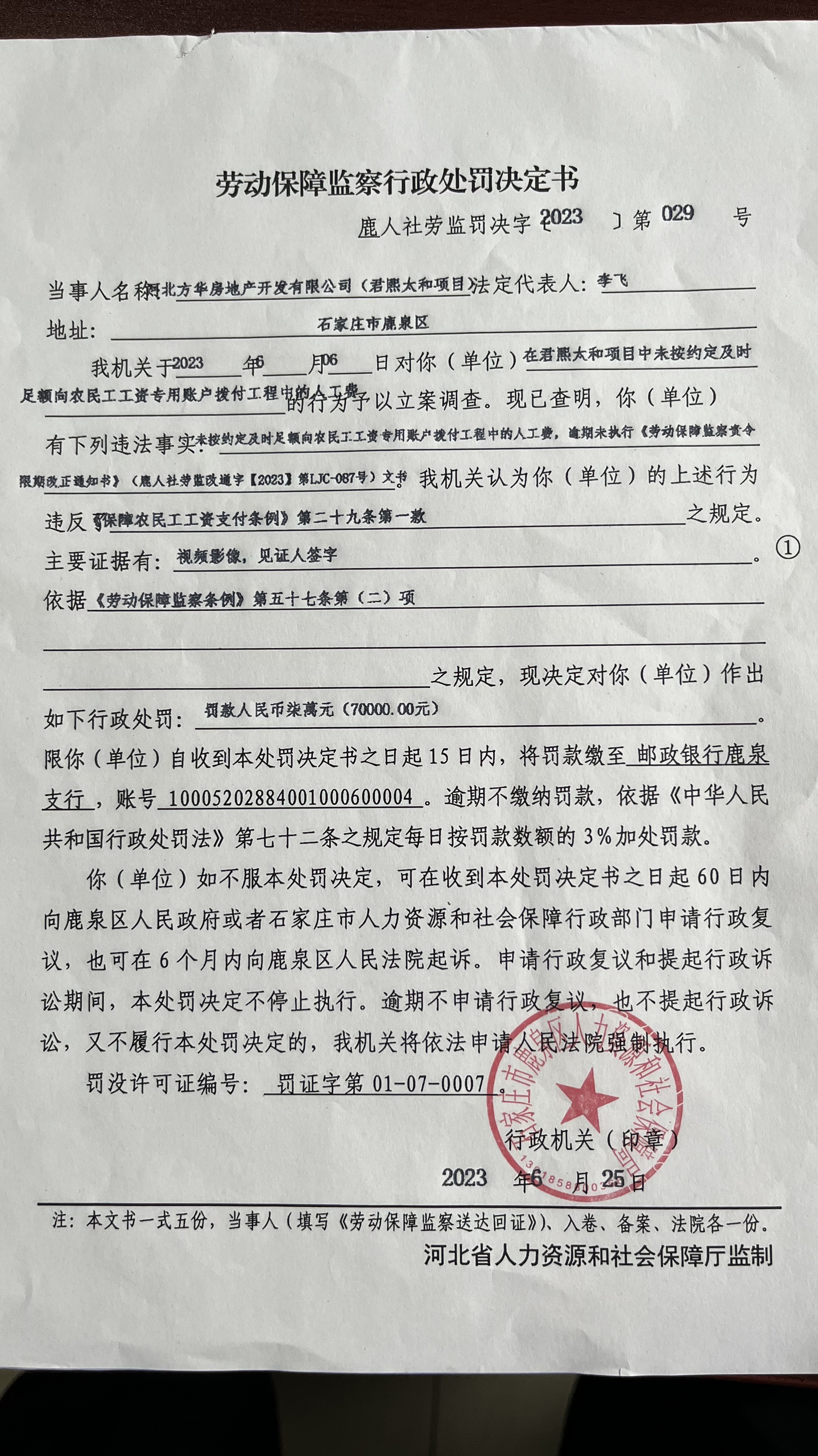 鹿人社劳监罚决字〔2023〕第029号