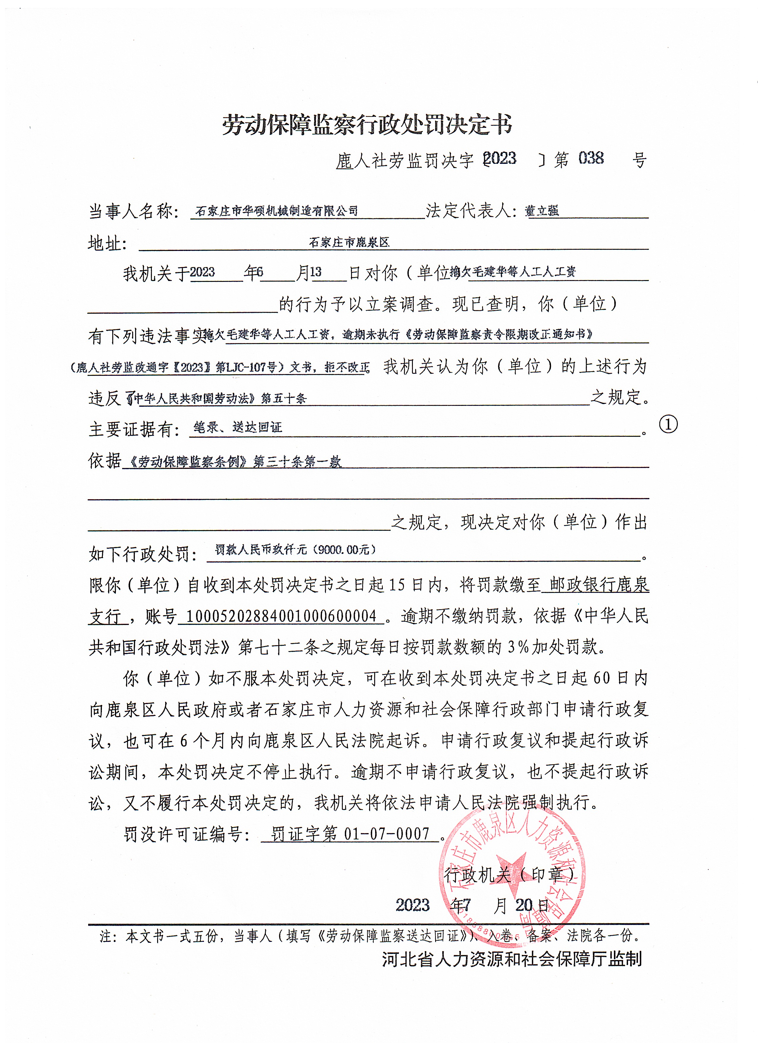 鹿人社劳监罚决字〔2023〕第038号