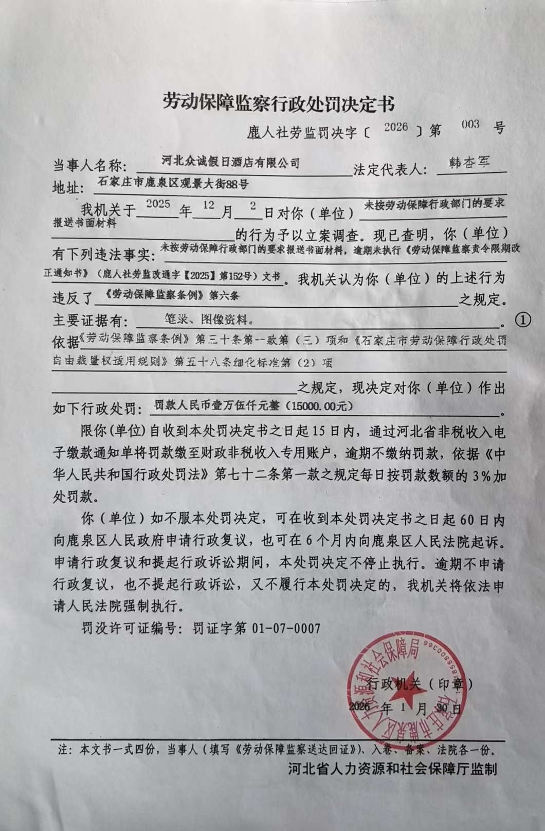 鹿人社劳监罚决字【2026】第003号