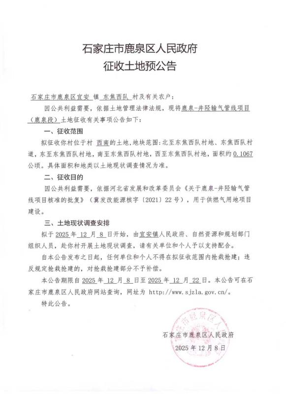 石家庄市鹿泉区人民政府征收土地预公告(鹿泉区宜安镇东焦西队村)