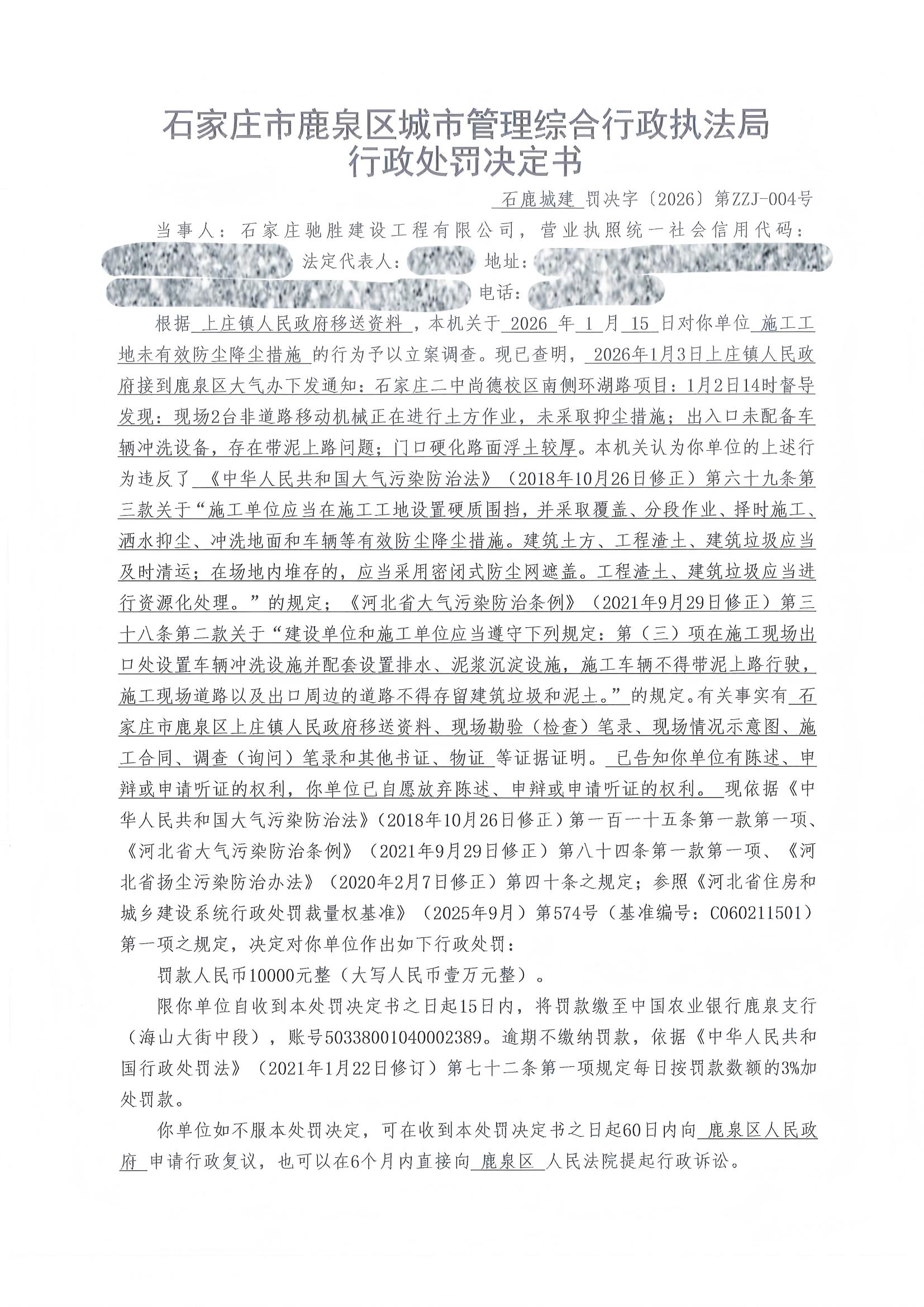 石家庄市鹿泉区城市管理综合行政执法局2026年度行政处罚公示ZZJ-004