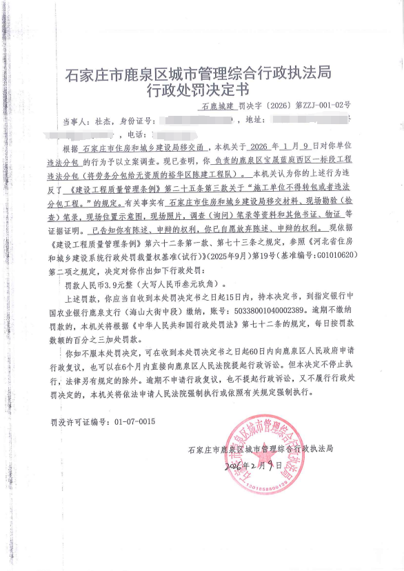 石家庄市鹿泉区城市管理综合行政执法局2026年度行政处罚公示ZZJ-001