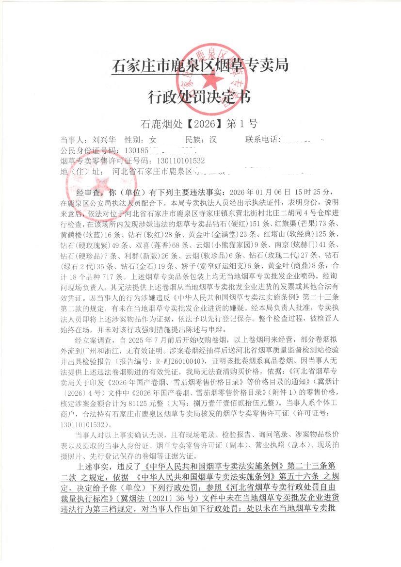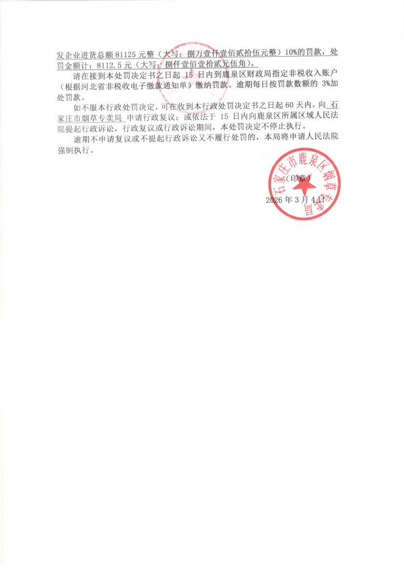 石家庄市鹿泉区烟草专卖局行政处罚决定书