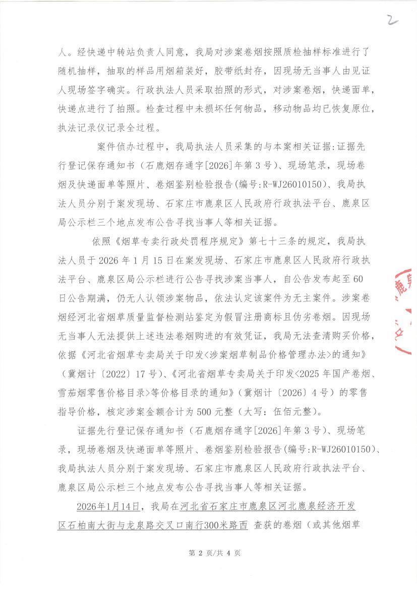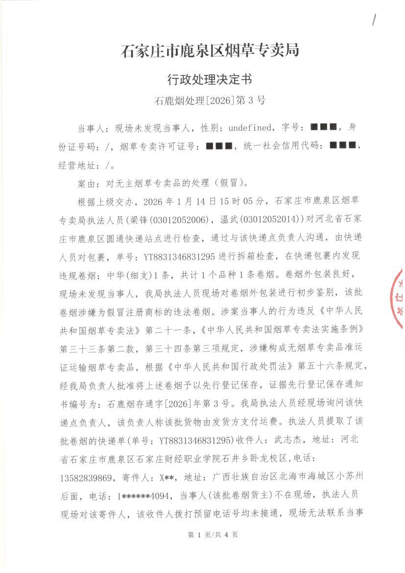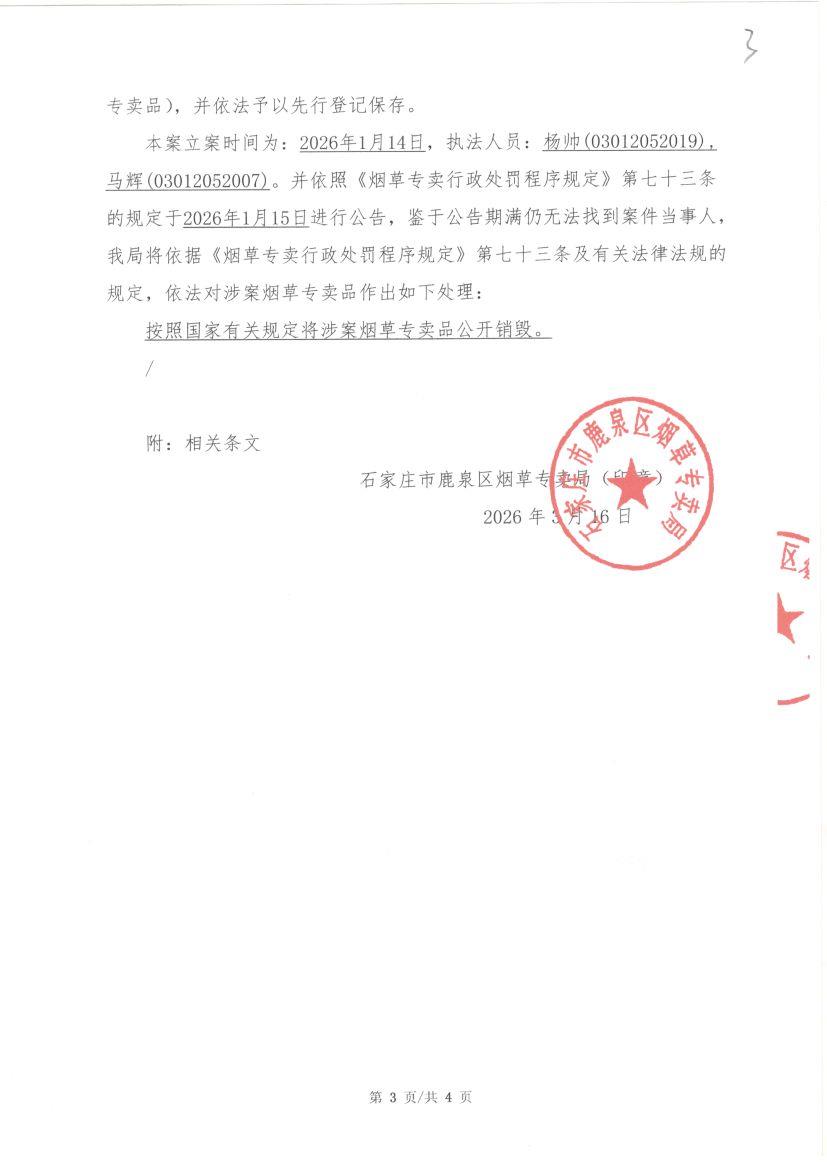石家庄市鹿泉区烟草专卖局行政处理决定书