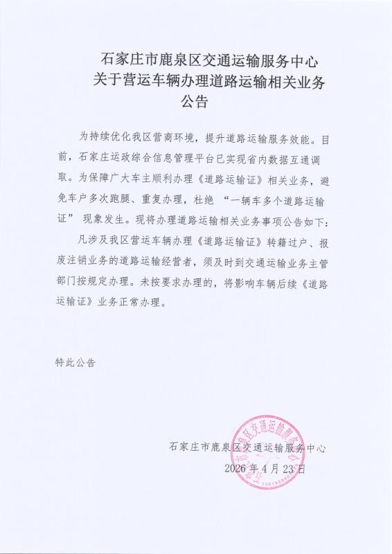 关于营运车辆办理道路运输相关业务公告