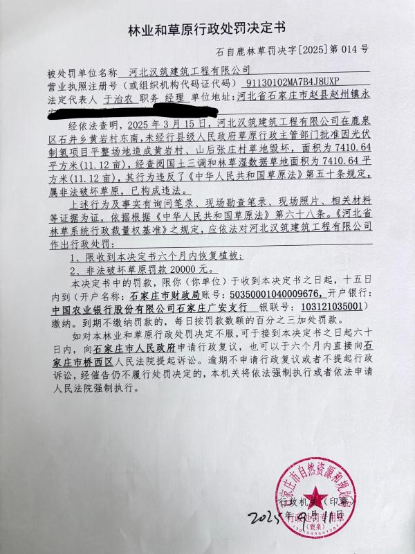 林业和草原行政处罚决定书石自鹿林草罚决字[2025]第014号