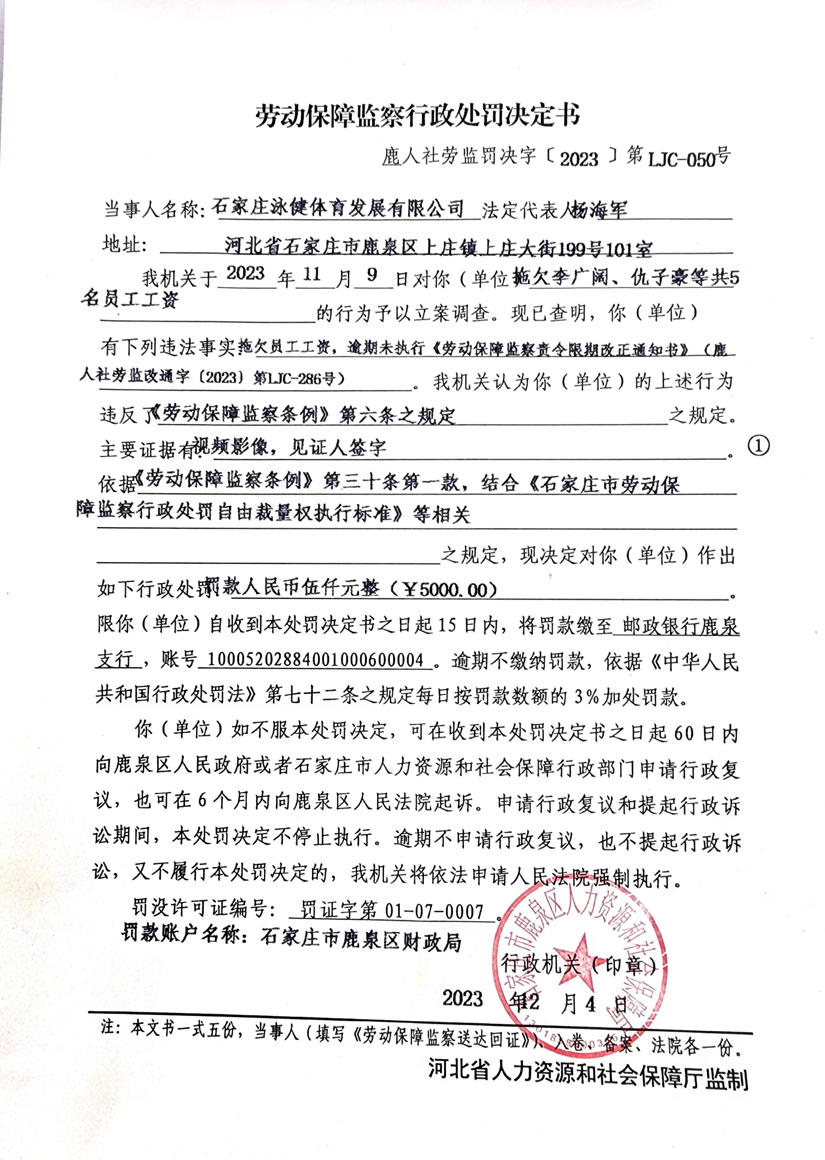 鹿人社劳监罚决字〔2023〕第LJC-050号