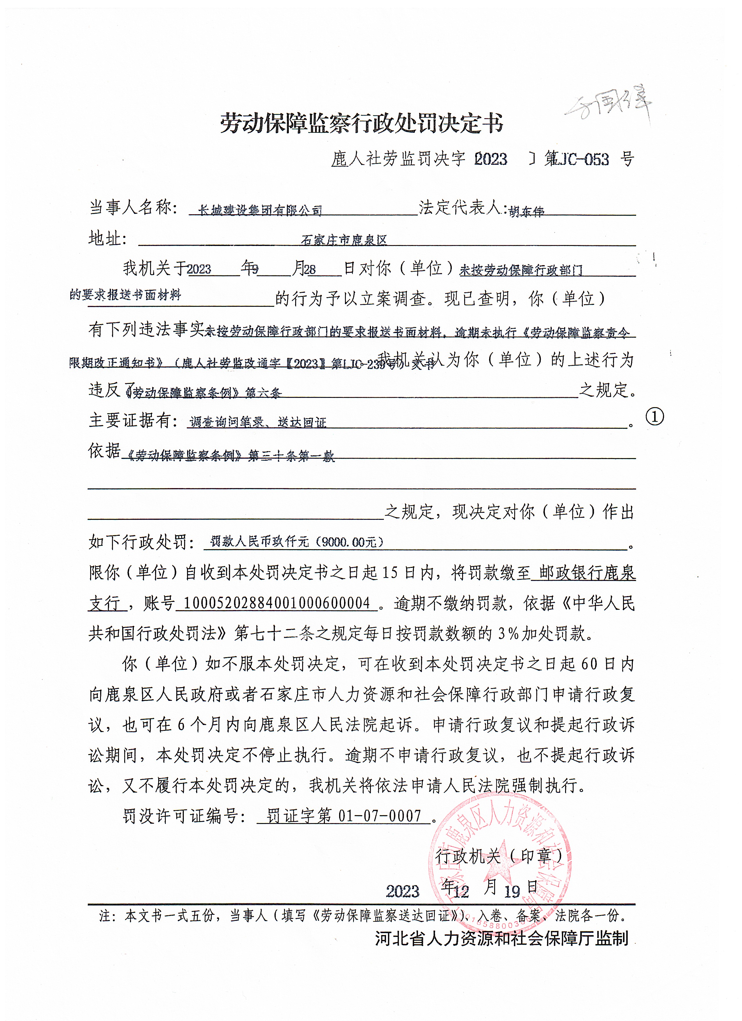 鹿人社劳监罚决字〔2023〕第LJC-053号