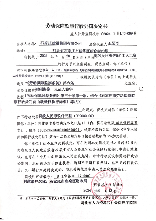 鹿人社劳监罚决字〔2024〕第LJC-009号