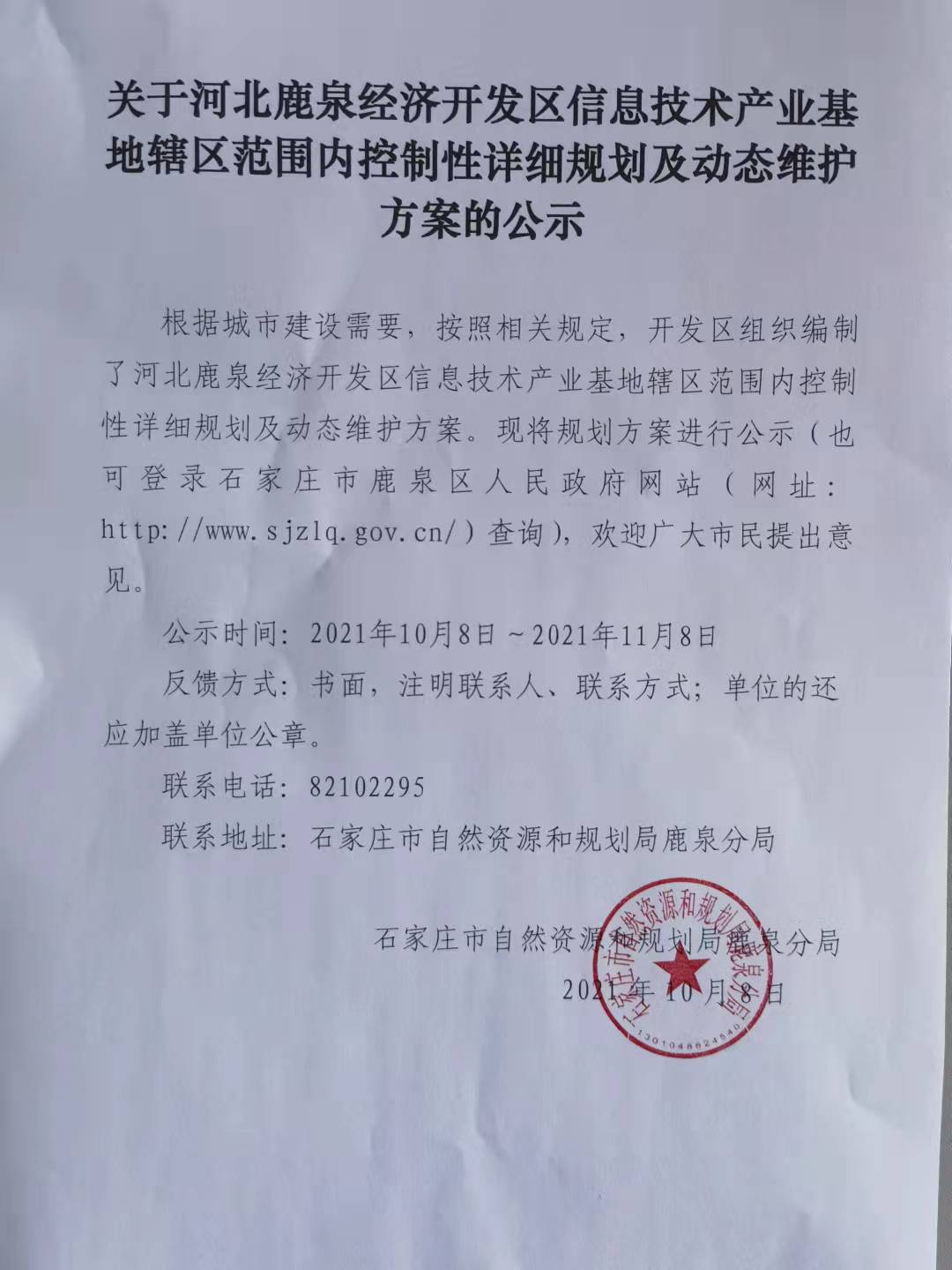 关于河北鹿泉经济开发区信息技术产业基地辖区范围内控制性详细规划及动态维护方案的公示