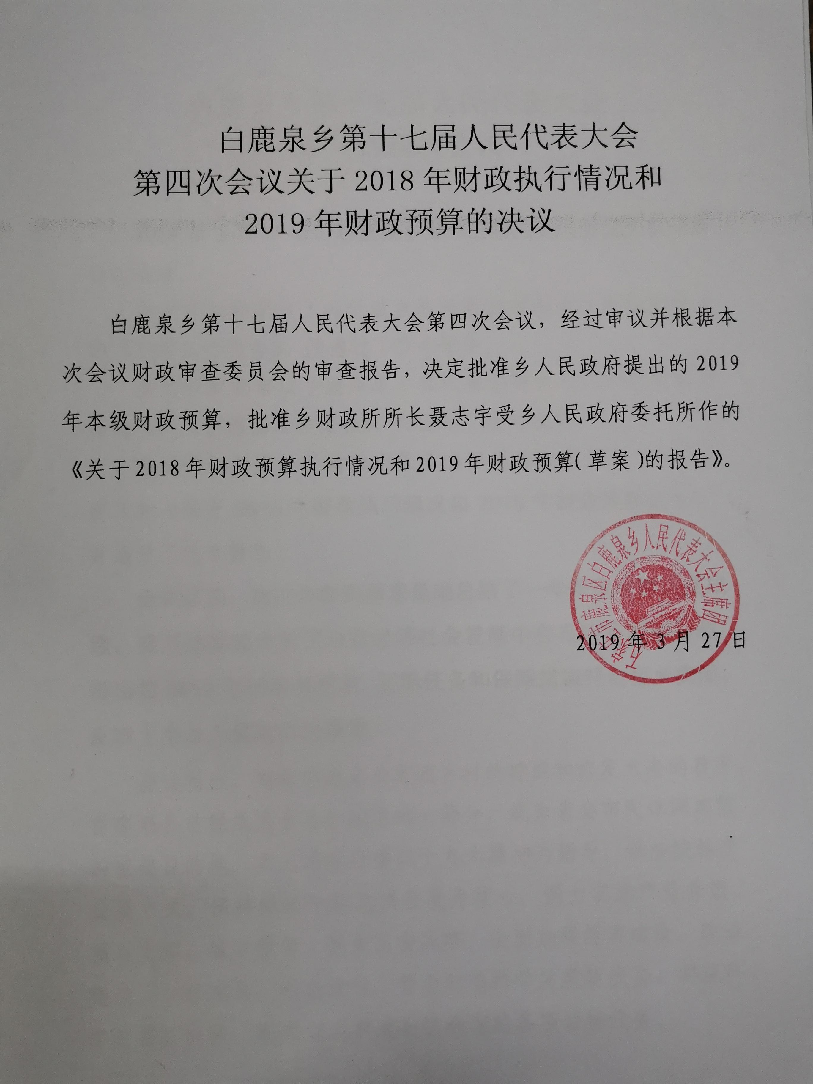 21___白鹿泉乡第十七届人民代表大会第四次会议关于2018年财政执行情况和2019年财政预算的决议