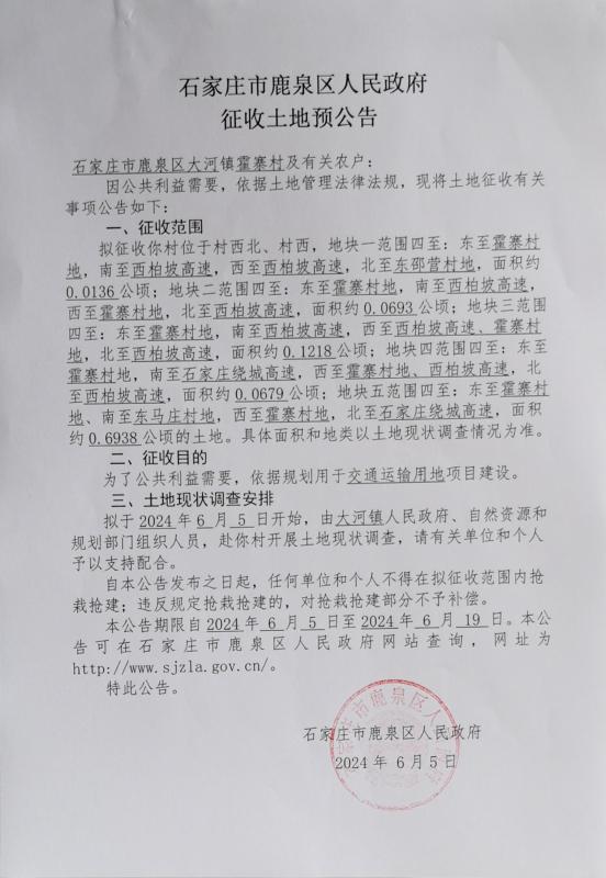 石家庄市鹿泉区人民政府征收土地预公告(石家庄市鹿泉区大河镇霍寨村)