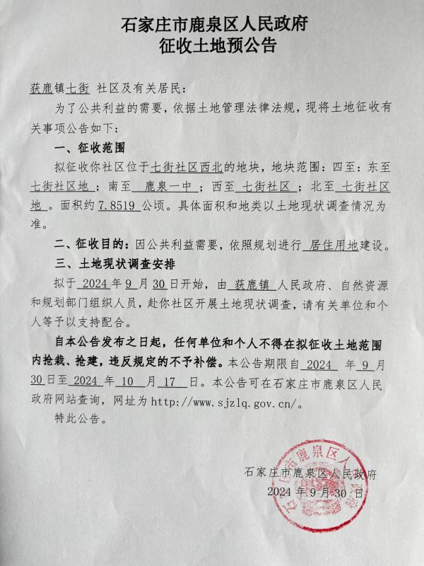 石家庄市鹿泉区人民政府征收土地预公告(获鹿镇七街社区)