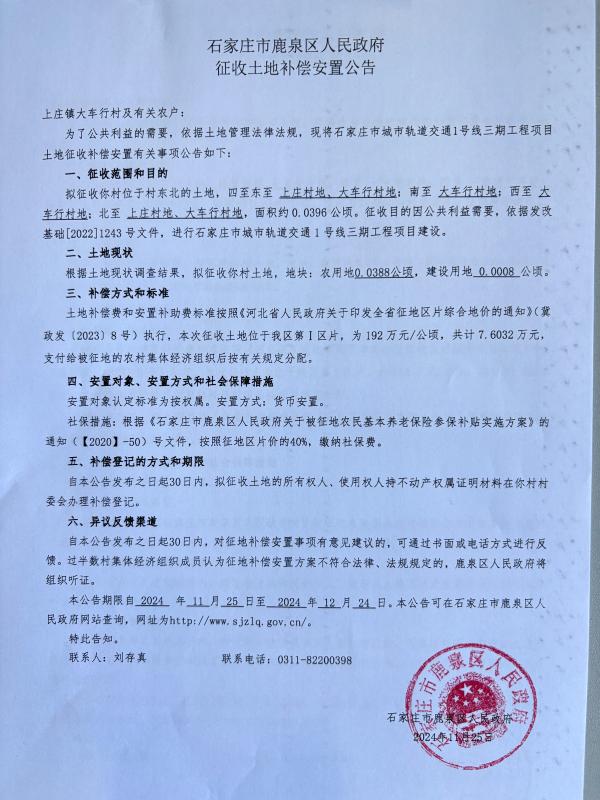 石家庄市鹿泉区人民政府征收土地补偿安置公告(上庄镇大车行村)