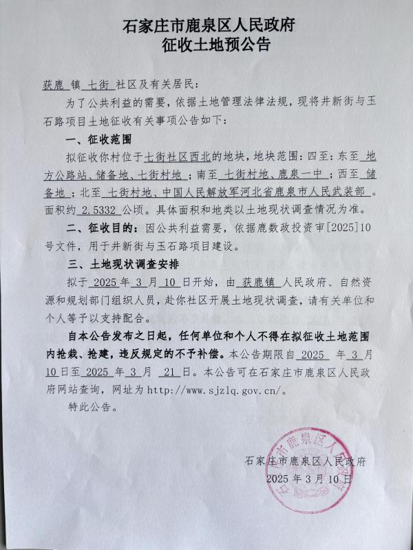 石家庄市鹿泉区人民政府征收土地预公告(获鹿镇七街社区约2.5332公顷)
