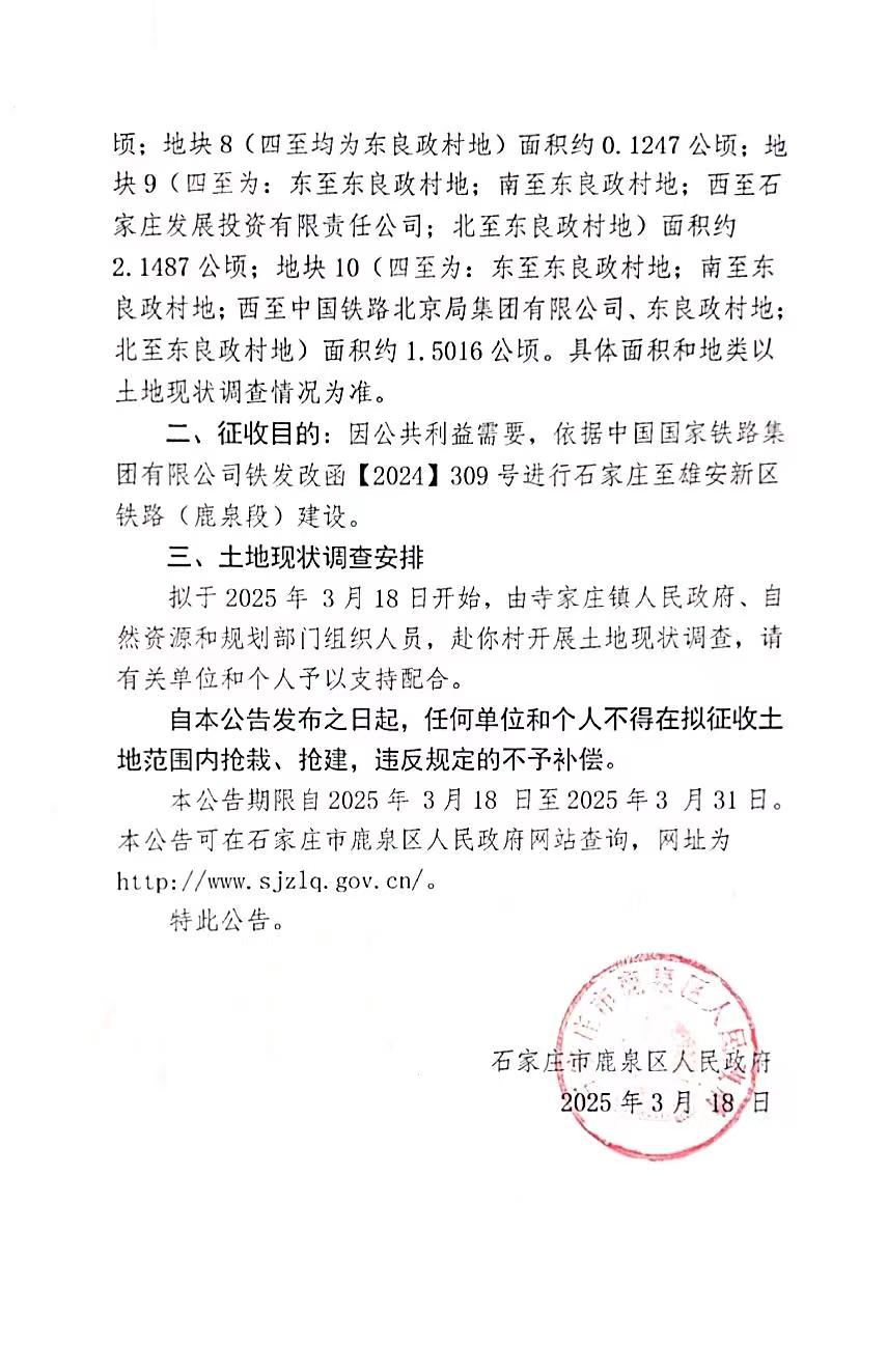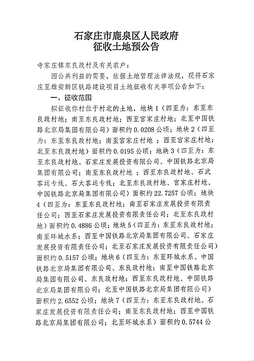 石家庄市鹿泉区人民政府征收土地预公告(寺家庄镇东良政村)