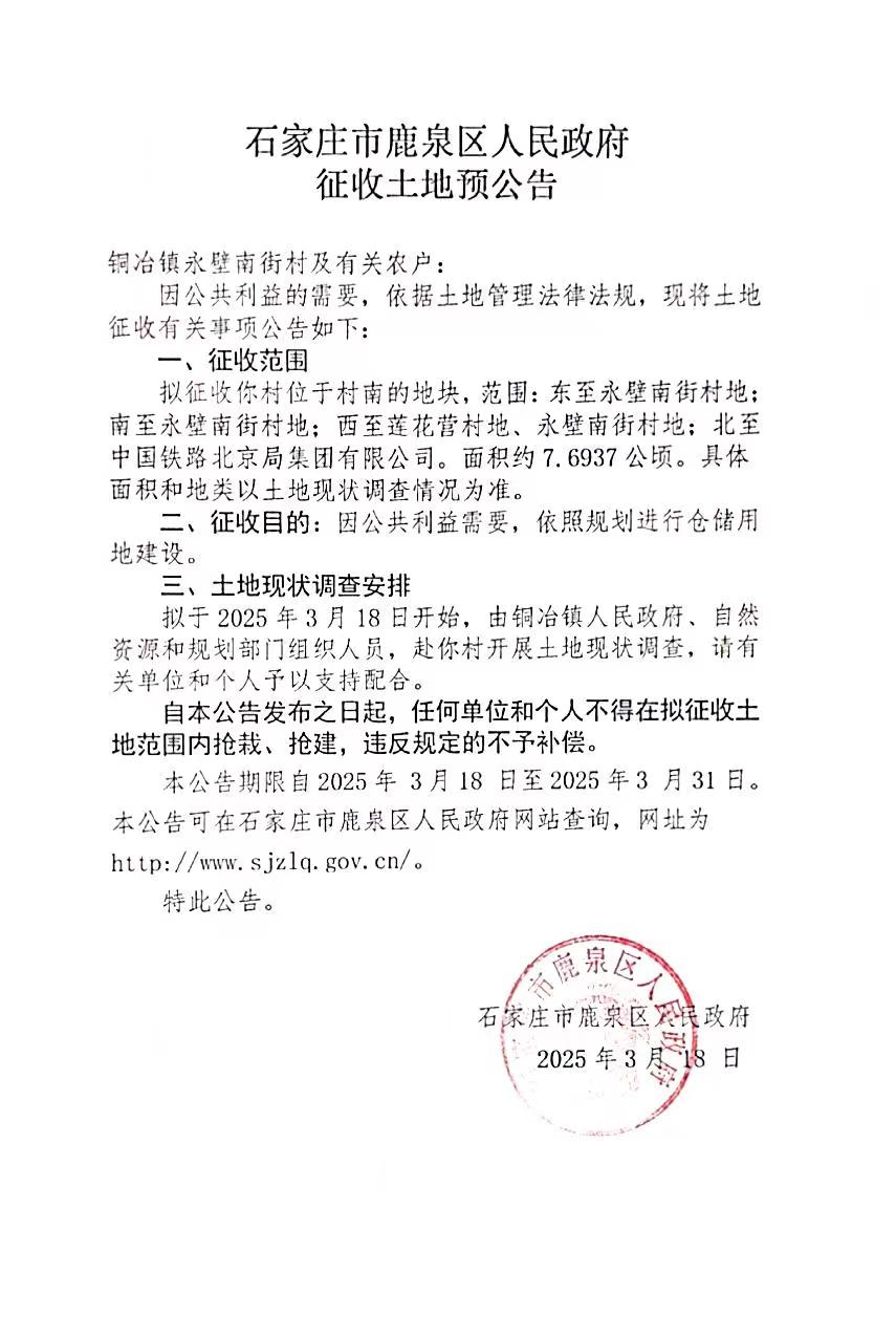 石家庄市鹿泉区人民政府征收土地预公告(铜冶镇永壁南街村)