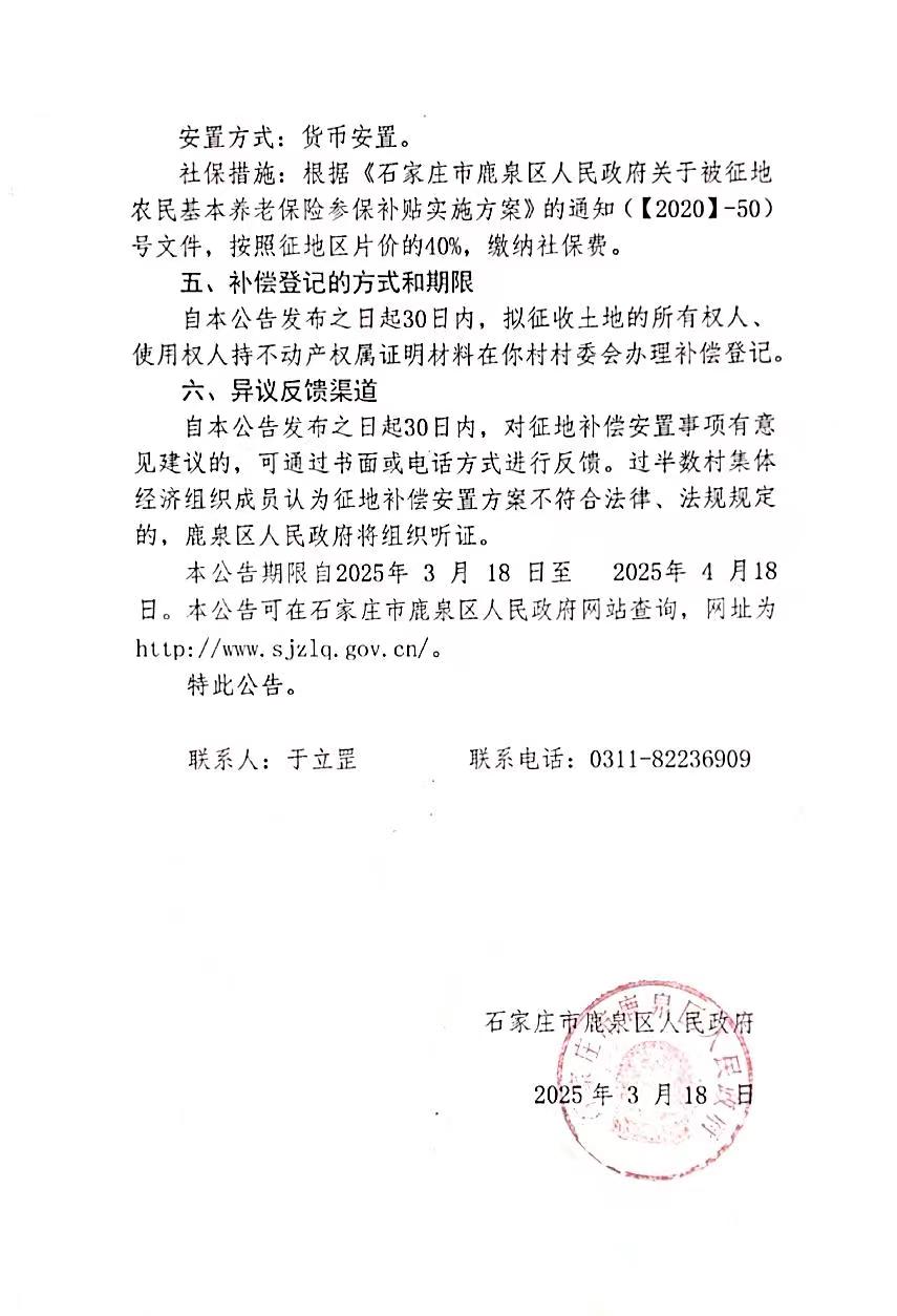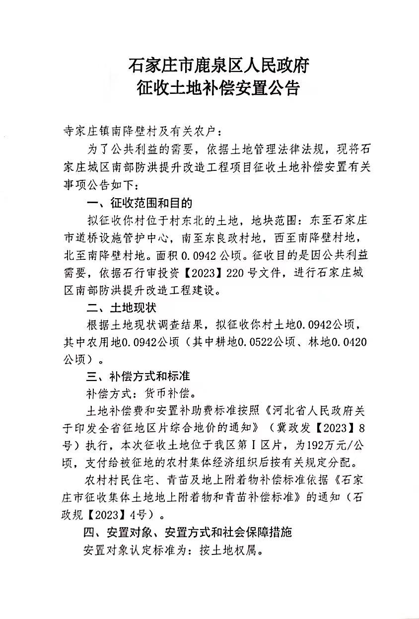 石家庄市鹿泉区人民政府征收土地补偿安置公告(寺家庄镇南降壁村)