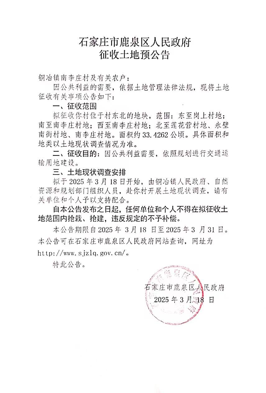 石家庄市鹿泉区人民政府征收土地预公告(铜冶镇南李庄村)