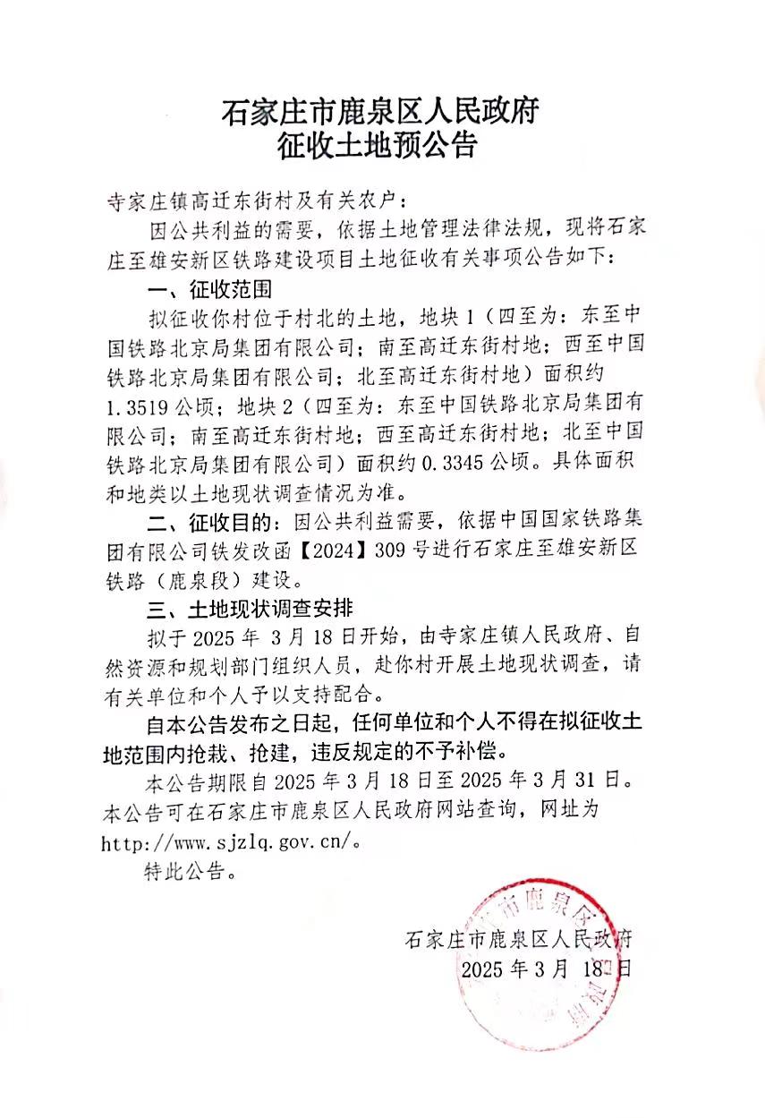 石家庄市鹿泉区人民政府征收土地预公告(寺家庄镇高迁东街村)