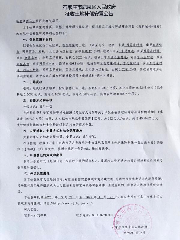 石家庄市鹿泉区人民政府征收土地补偿安置公告(获鹿镇西马庄社区)