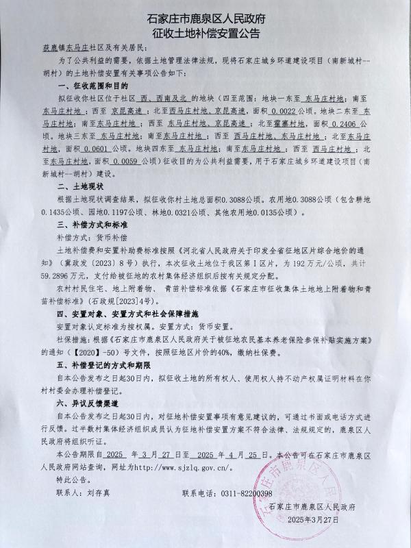 石家庄市鹿泉区人民政府征收土地补偿安置公告(获鹿镇东马庄社区)
