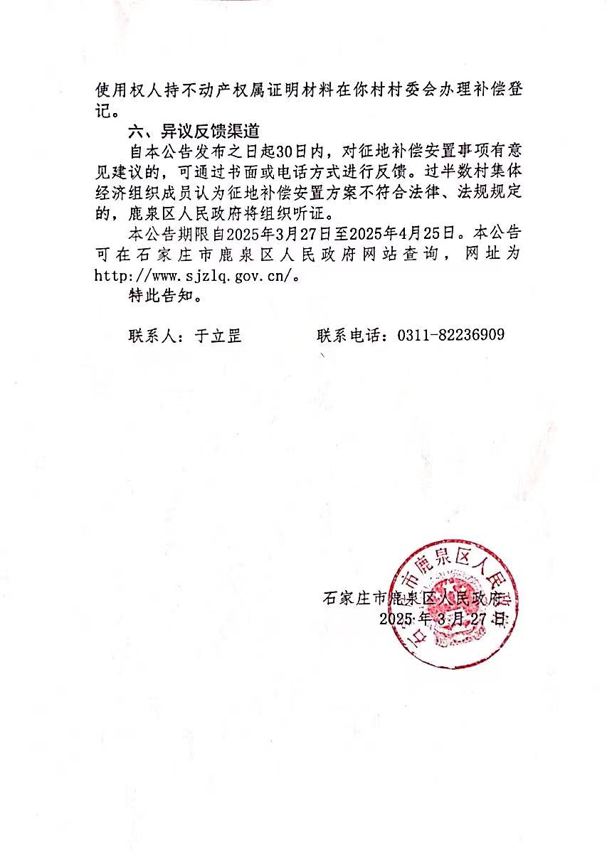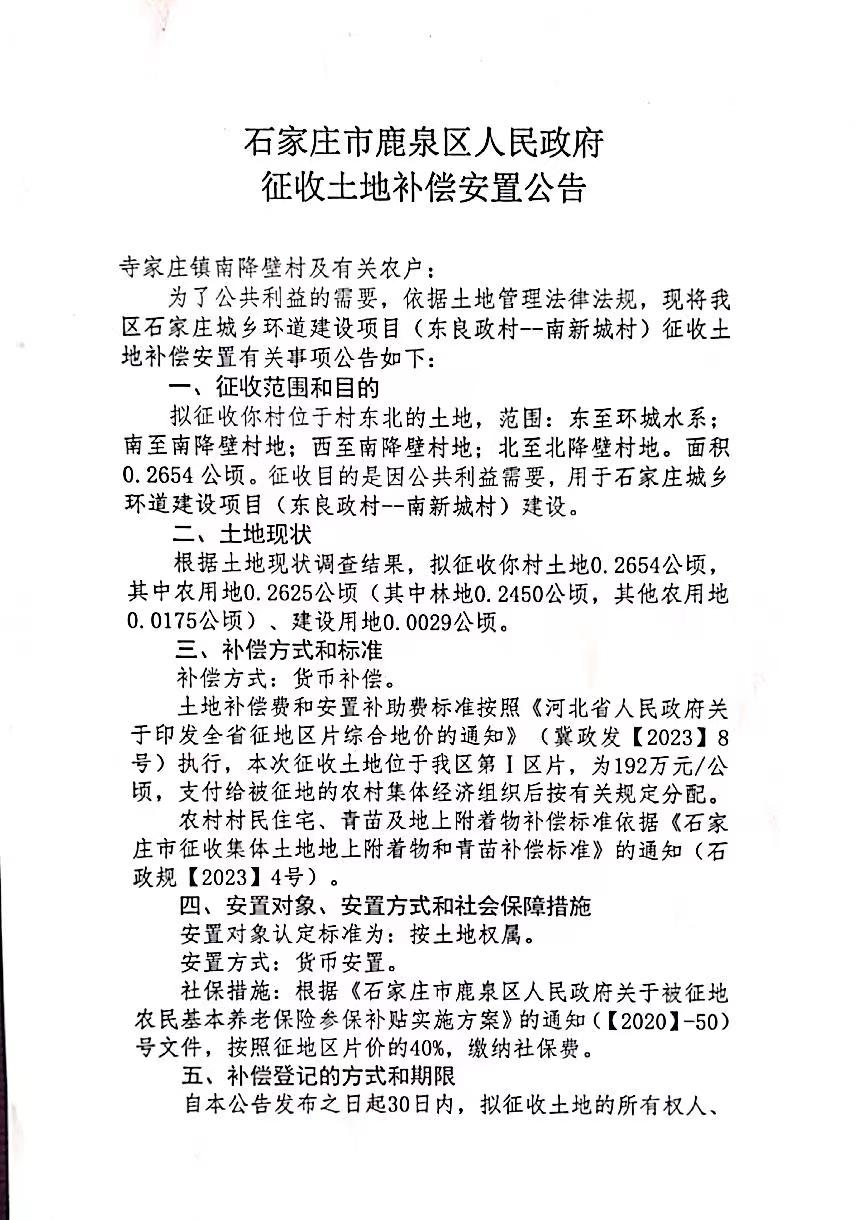 石家庄市鹿泉区人民政府征收土地补偿安置公告(寺家庄镇南降壁村)