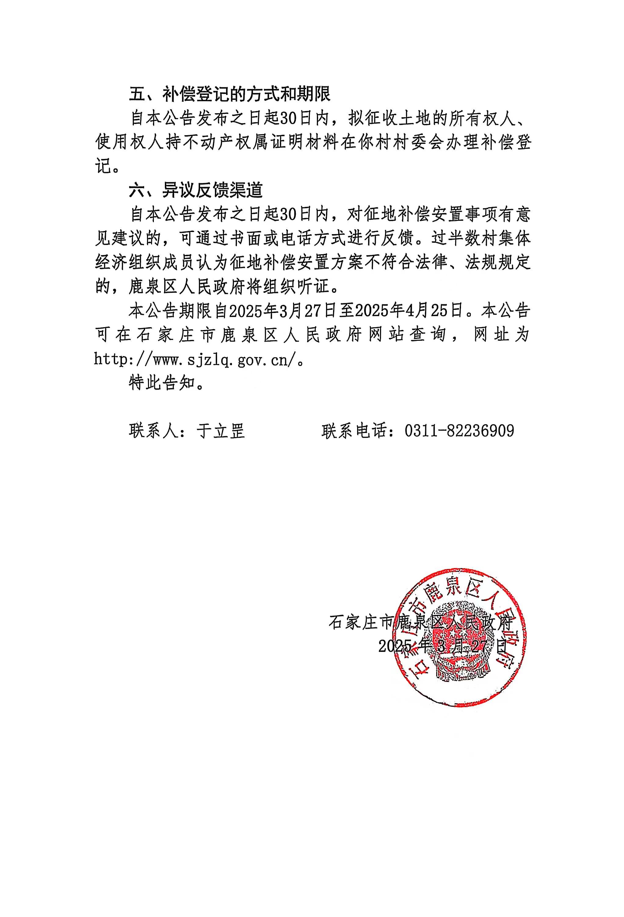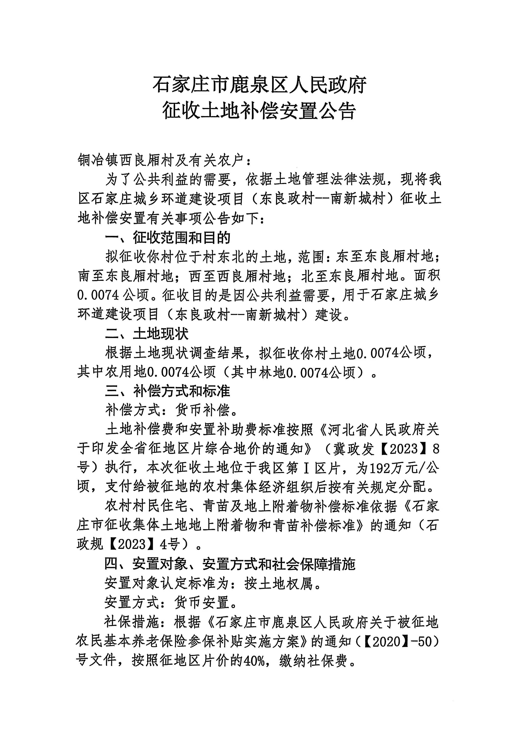 石家庄市鹿泉区人民政府征收土地补偿安置公告(铜冶镇西良厢村)