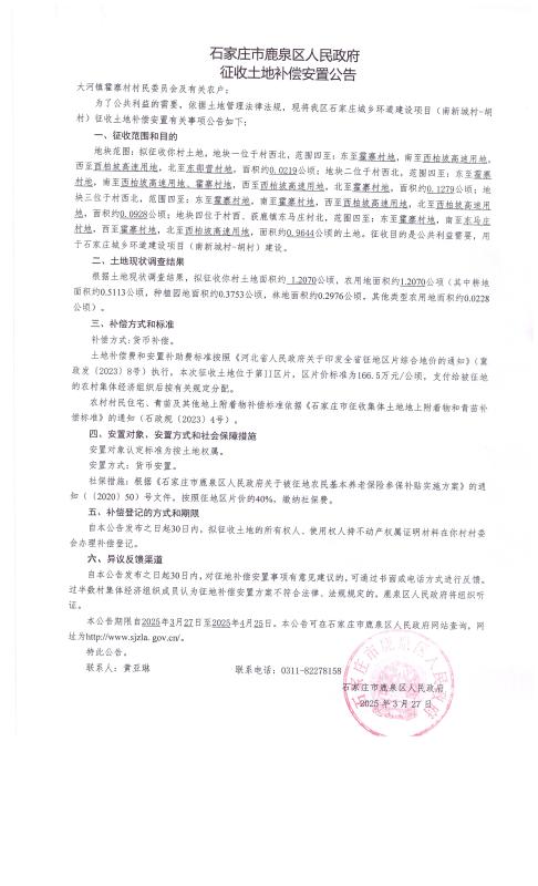 石家庄市鹿泉区人民政府征收土地补偿安置公告(大河镇霍寨村)