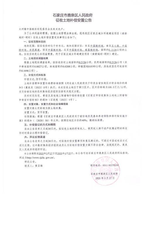 石家庄市鹿泉区人民政府征收土地补偿安置公告(大河镇中落陵村)
