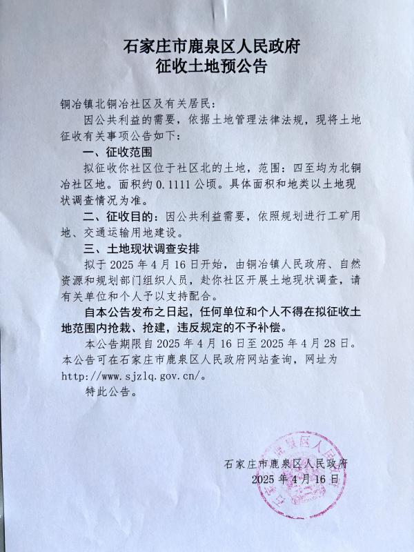石家庄市鹿泉区人民政府征收土地预公告(铜冶镇北铜冶社区面积约0.111公顷)