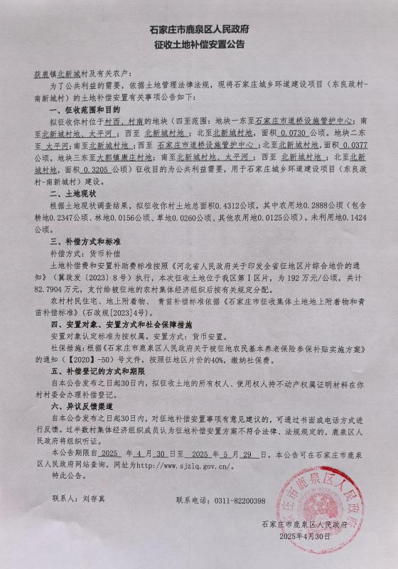 石家庄市鹿泉区人民政府征收土地补偿安置公告(获鹿镇北新城村0.0730公顷 0.0377公顷 0.3205公顷)