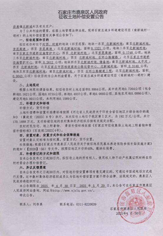 石家庄市鹿泉区人民政府征收土地补偿安置公告(获鹿镇北新城村0.1321公顷 0.1748公顷 0.2612公顷 0.3140公顷 0.0043公顷)