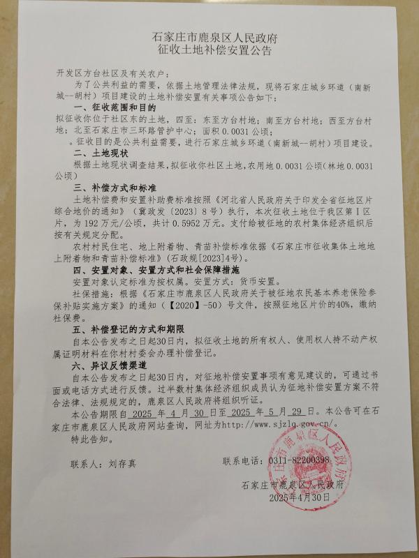 石家庄市鹿泉区人民政府征收土地补偿安置公告(开发区方台社区0.0031公顷)