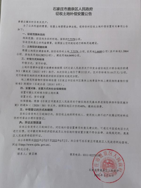 石家庄市鹿泉区人民政府征收土地补偿安置公告(黄壁庄镇田村)