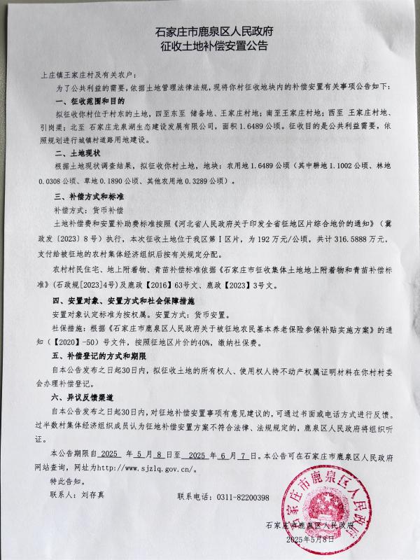 石家庄市鹿泉区人民政府征收土地补偿安置公告(上庄镇王家庄村)