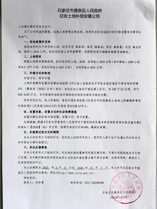 石家庄市鹿泉区人民政府征收土地补偿安置公告(上庄镇庄窝村)
