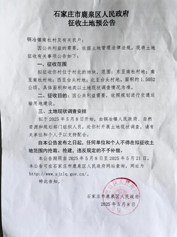 石家庄市鹿泉区人民政府征收土地预公告(铜冶镇南杜村)