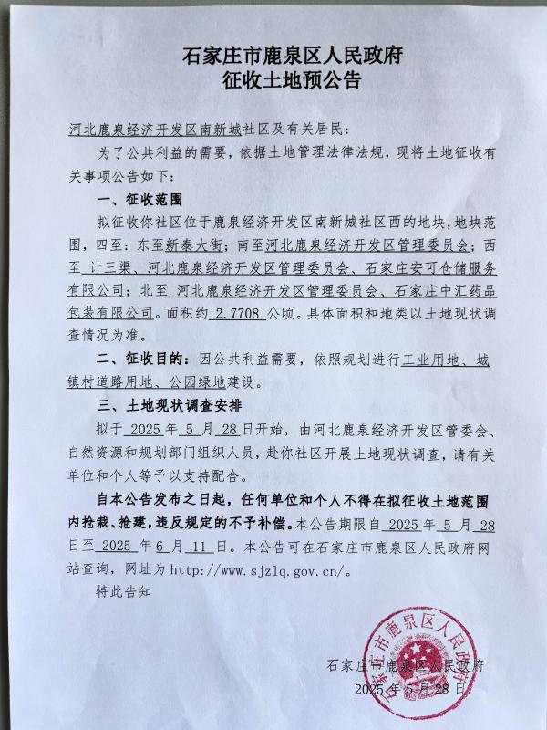 石家庄市鹿泉区人民政府征收土地预公告(河北鹿泉经济开发区南新城社区)
