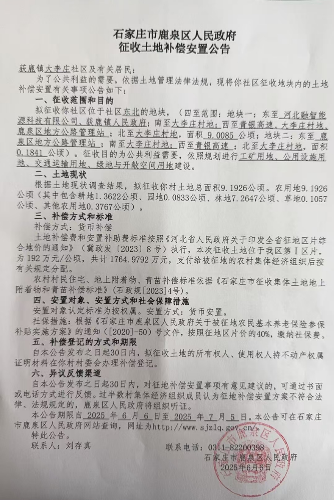石家庄市鹿泉区人民政府征收土地补偿安置公告(获鹿镇大李庄社区)