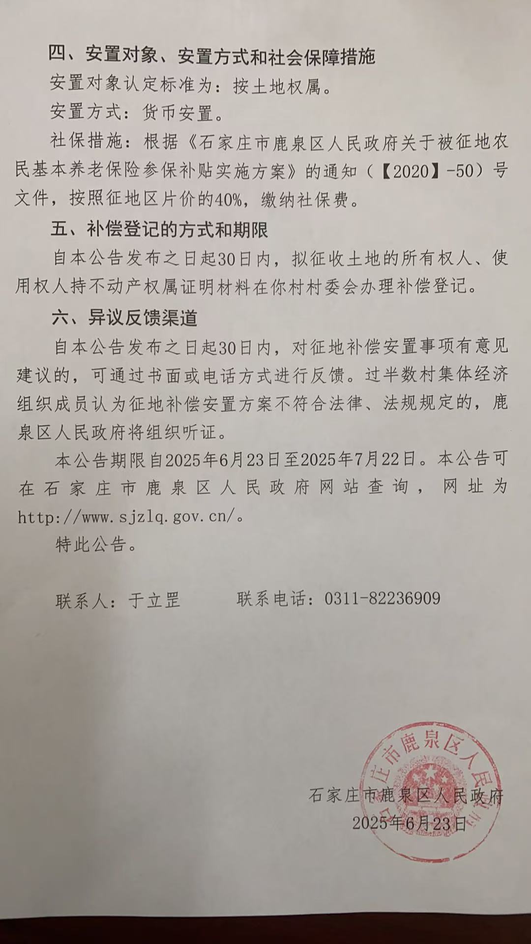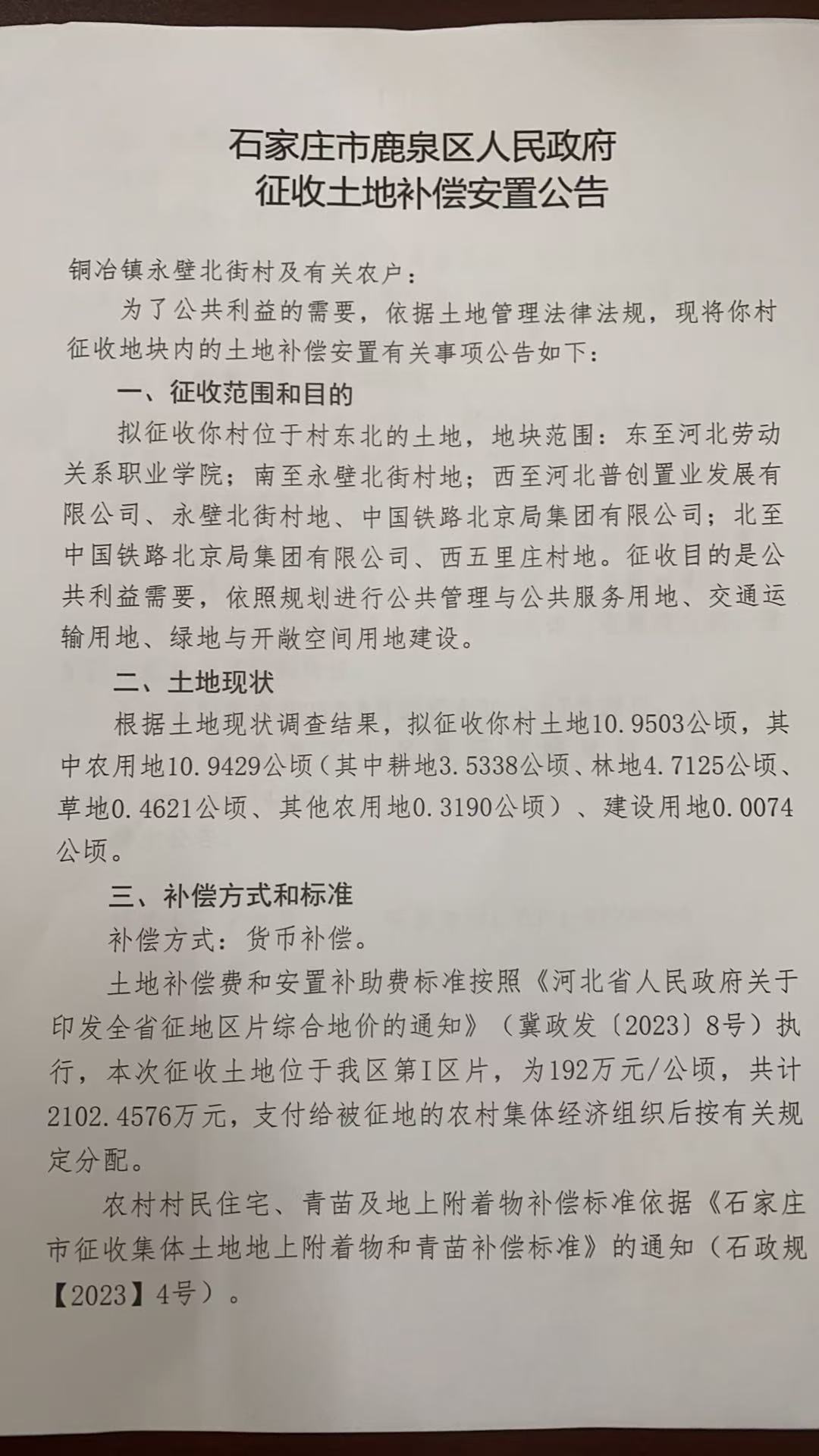 石家庄市鹿泉区人民政府征收土地补偿安置公告(铜冶镇永壁北街村)