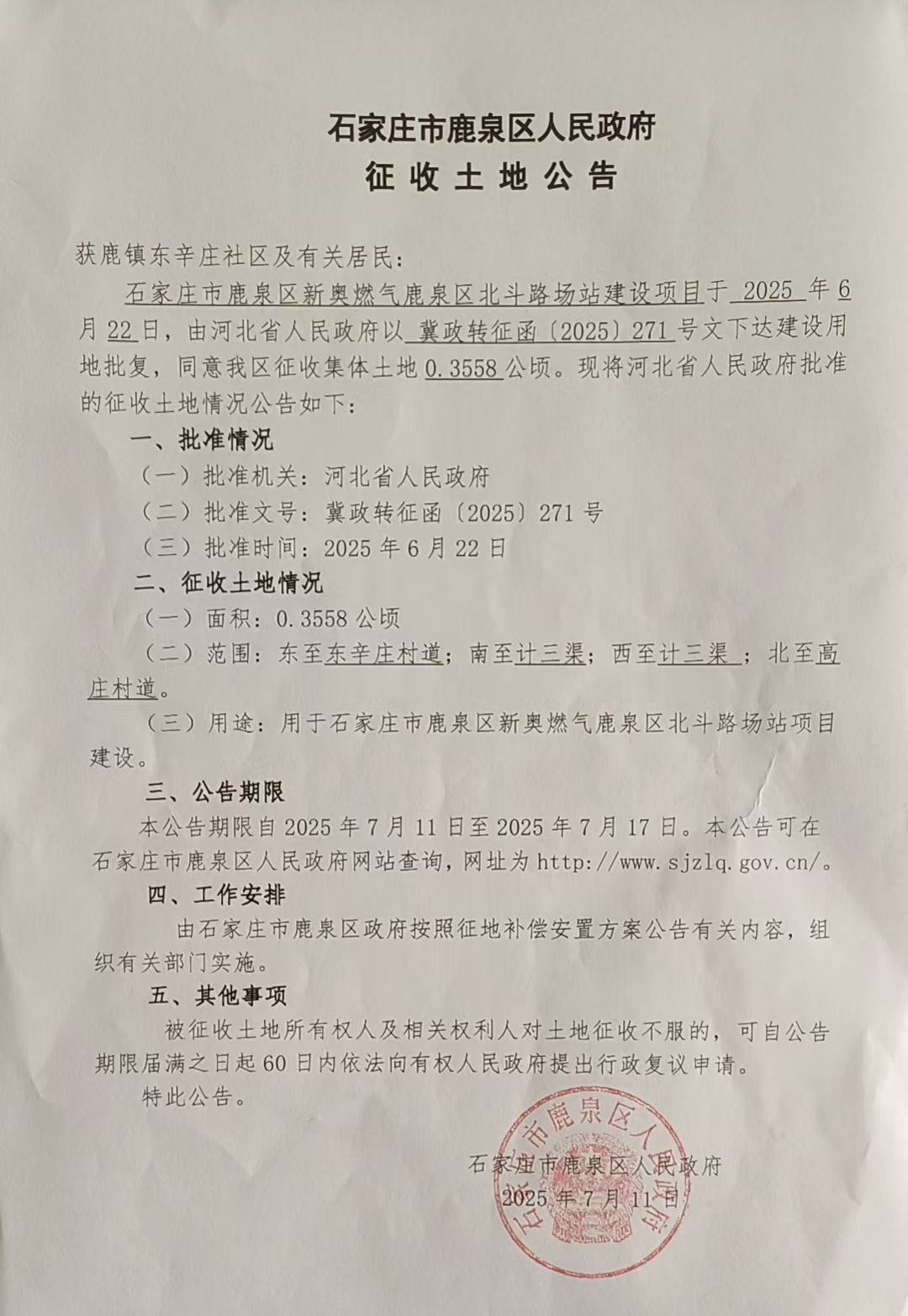 石家庄市鹿泉区人民政府征收土地公告(获鹿镇东辛庄社区)