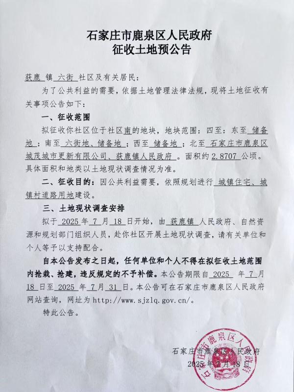 石家庄市鹿泉区人民政府征收土地预公告(获鹿镇六街社区)