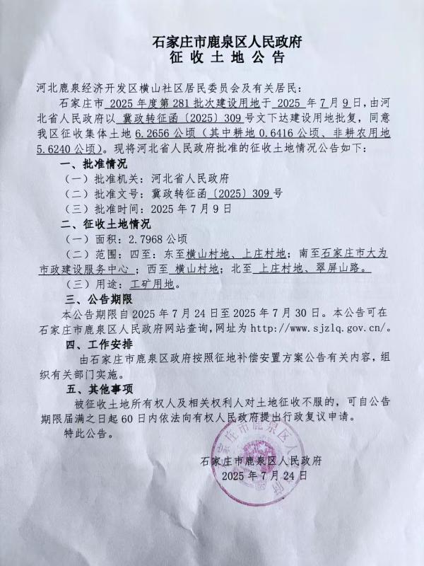 石家庄市鹿泉区人民政府征收土地公告(河北鹿泉经济开发区横山社区)