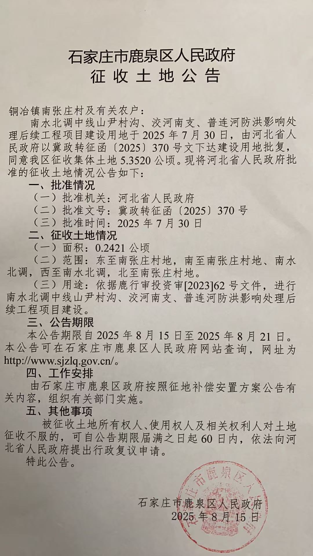 石家庄市鹿泉区人民政府征收土地公告(铜冶镇南张庄村)