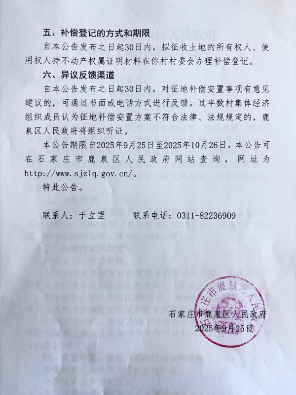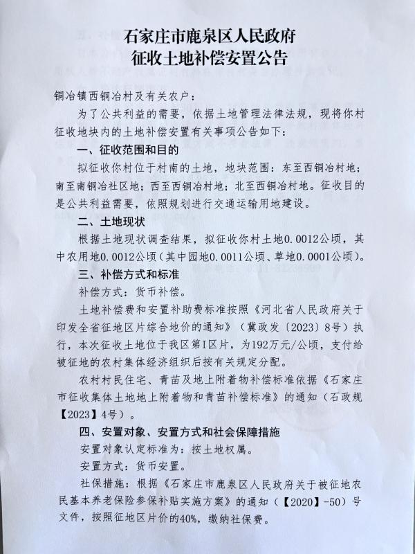 石家庄市鹿泉区人民政府征收土地补偿安置公告(铜冶镇西铜冶村)