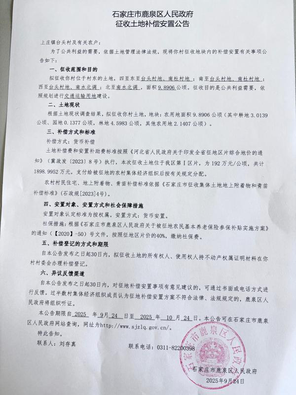 石家庄市鹿泉区人民政府征收土地补偿安置公告(上庄镇台头村)