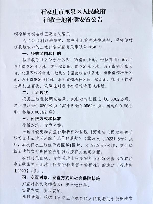 石家庄市鹿泉区人民政府征收土地补偿安置公告(铜冶镇南铜冶社区)