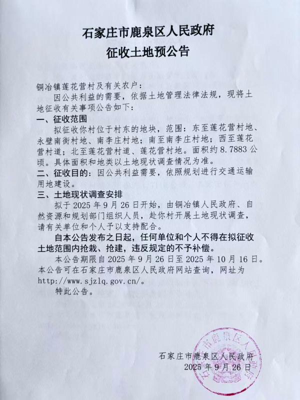 石家庄市鹿泉区人民政府征收土地预公告(铜冶镇莲花营村)