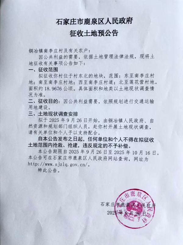 石家庄市鹿泉区人民政府征收土地预公告(铜冶镇南李庄村)